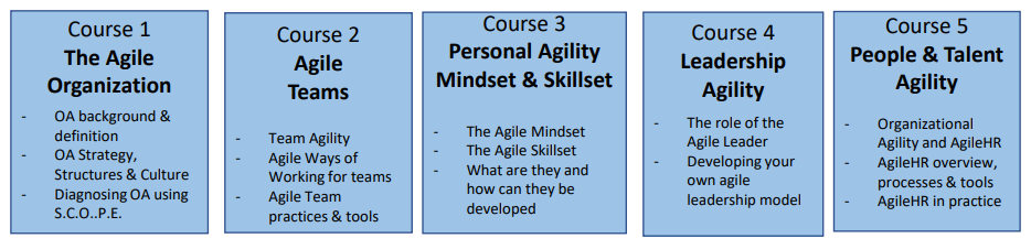 • Delivered as a blended learning experience through a mix of self-directed online learning combined with live peer-to-peer, application sessions facilitated by experts in the field of Agility as well as organisational and leadership development